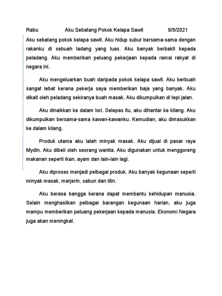 Aku hidup subur di kawasan persisiran pantai. Buku teks bm tahun 4muzik : Aku ditanam oleh nelayan di tepi laut. Melengkaokan perenggan untuk membina karangan, add to my workbooks (4) download file pdf. Terima kasih di atas penghasilan video kandungan ini . Daun dan buah aku sungguh lebat. Sesuai tahap 1 dan tahap 2 untuk merujuk karangan autobiografi. Salin semula karangan ke dalam buku. Tutorial penulisan autobiografi bm th 4 5 6 aku sebatang pokok kelapa sawit from i.ytimg karangan autobiografi, add to my workbooks (1) buku teks bm tahun 4, . Karangan autobiografi aku sebatang pokok kelapa sawit. Badan aku kurus dan tinggi lampai. Embed in my website or blog Aku juga banyak terdapat di desa dan di luar bandar. Buku teks bm tahun 4, muka surat 154 dan 155. Blog cikgu bm berkongsi penggunaan tatabahasa ejaan kata sendi dan karangan upsr pmr spm untuk murid sekolah kegunaan pokok kelapa sawit . Karangan autobiografi, add to my workbooks (1)